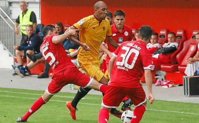 Sin embargo, tras ese ímpetu inicial, las fuerzas se igualaron muy pronto. La presión adelantada de los nervionenses hacía que el equipo se partiera en dos y el Mainz trataba de explotar esa debilidad defensiva al contragolpe, avisando con un cabezazo del ex sevillista Jairo a centro de Donati.