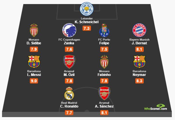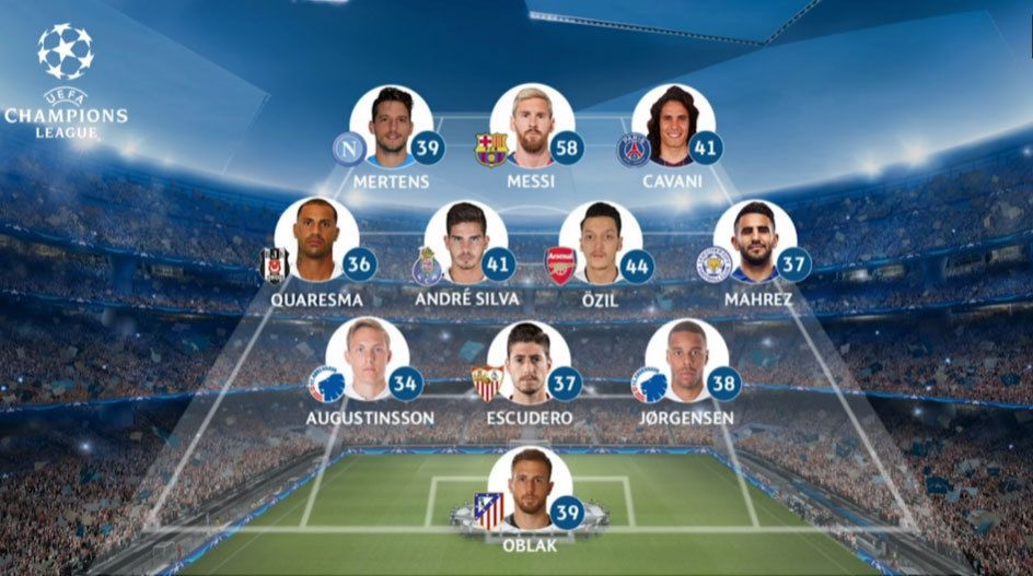 El resto del equipo lo componen el ahora lesionado Oblak (Atlético de Madrid), Jorgesen, Augustinsson (Copenghague), André Silva (Porto), Özil (Arsenal), Quaresma (Besiktas), Mahrez (Leicester), Mertens (Napoli), Messi (Barcelona) y Cavani (PSG).