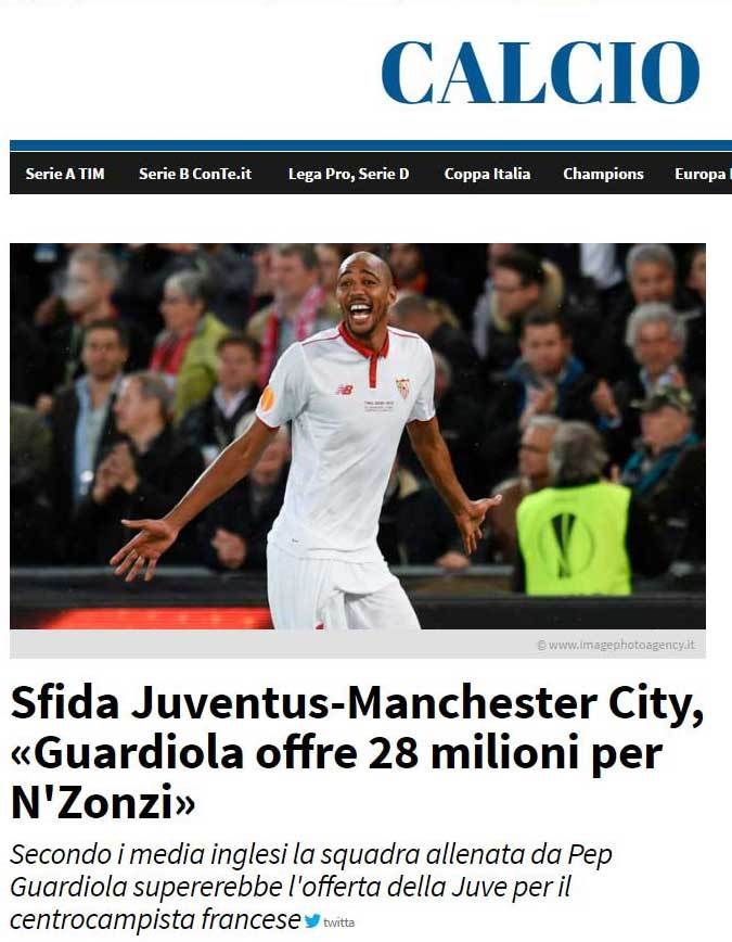 Este mismo viernes, 'Mirror' asegura que los 'citizens' van a poner 28 millones de euros (imagen de Tuttosport), una cantidad muy cercana a su cláusula, para tratar de llevarse a N'Zonzi, al estar Pep Guardiola enamorado del sevillista.