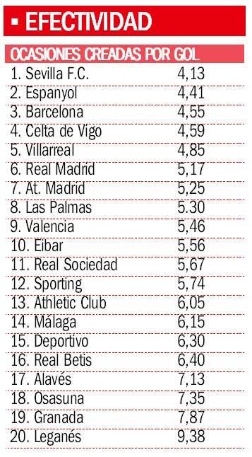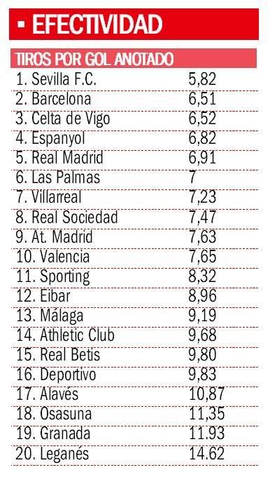 Celta de Vigo, muy parejo al Barça, Espanyol y Real Madrid son los siguientes en la tabla. El Leganés, con casi 15 tiros para hacer gol, y el Granada, que requiere casi 12 lanzamientos a puerta, son la otra cara de la moneda en cuanto a eficiencia futbolística se refiere.
