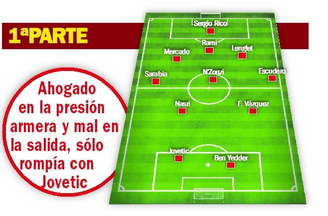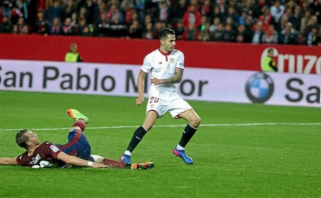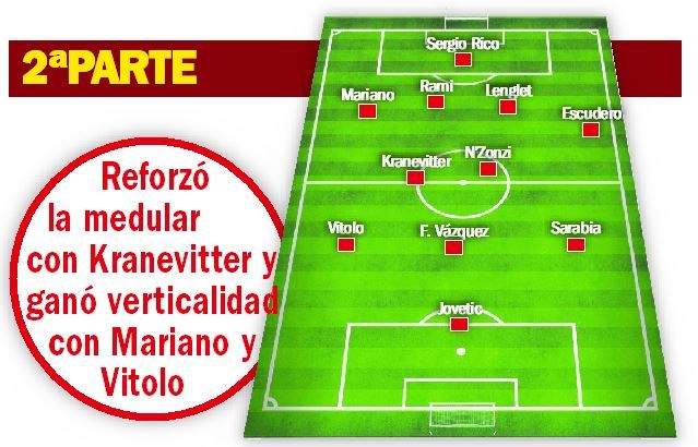 La ventaja no otorgó el control al Sevilla, huérfano en la medular y sometido a las embestidas del Eibar, por lo que Sampaoli optó por Mariano y Vitolo para ganar en verticalidad y por Kranevitter para reforzar la medular. Medidas con las que resolvió el partido.