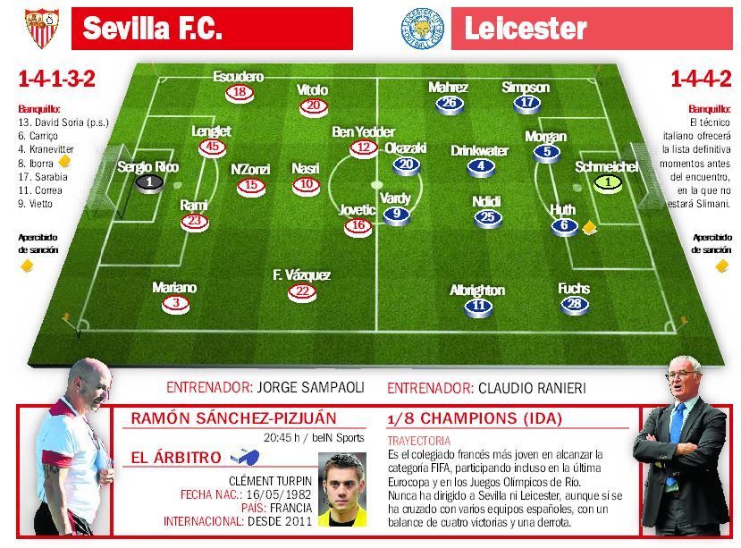 Confirmada a última hora la baja en ataque de Slimani, a quien suplirá Okazaki o Leo Ulloa, los 'zorros' quieren recuperar el carácter que les llevó a asombrar al mundo con su título liguero y adoptar la piel que han vestido en esta Champions, en la que encabezaron su grupo. Un rival herido que en Nervión quieren cazar con su temible rugido.