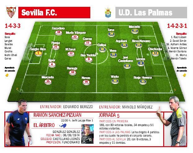 Berizzo no quiere que se traslade al césped el previsible clima hostil en la grada, que no debe pasar la línea que separa la indiferencia o los silbidos para llegar a insultos que podrían acarrear graves consecuencias a la entidad. El técnico prefiere que los cinco sentidos estén en lo futbolístico, entre otras razones porque su Sevilla no termina de ejercer un dominio constante, quizás porque sigue sin haber un 'once tipo' que permita automatizar movimientos en ataque y en defensa. El 'Toto' mantendrá hoy las rotaciones en un equipo titular en el que sólo se mantendrían Sergio Rico y Banega. N´Zonzi, que sólo ha descansado en el partido ante el Getafe, podría permitir -por la ausencia de Pizarro- el debut como titular de Geis, que tuvo tan sólo tres minutos ante el Eibar. Teniendo en cuenta el reparto de esfuerzos, junto a Banega, imprescindible ´faro´ del equipo, también debutaría como titular el 'Mudo' Vázquez, ocupando la plaza de Ganso. La defensa también cambiaría completamente respecto a Girona: Mercado, Kjaer, Pareja y Escudero. Navas por Montoya, Correa por Sarabia y Ben Yedder por Muriel completarían una nueva 'revolución'. Las Palmas llega con muchas bajas, pero con la moral alta tras sus dos triunfos consecutivos en Málaga (1-3) y frente al Athletic (1-0), y pendiente del 'efecto Vitolo'. Contra el Atlético no jugó el canario. Sí va a estar en Nervión y su presencia puede activar aún más a una afición que sigue viendo a su equipo con más puntos que fútbol.