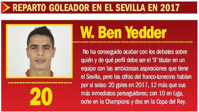 Apunto de despedir el 2017, toca hacer balances y, en clave sevillista, sin duda el hombre del año ha sido Wissan Ben Yedder, quien si bien acaba con una espinita clavada, por el hecho de que Berizzo no le diese minutos en el Camp Nou y en el Santiago Bernabéu, también lo hace con unos números para sacar pecho. No en vano, un 24 por ciento, es decir, casi uno de cada cuatro goles que ha anotado el Sevilla desde enero hasta diciem