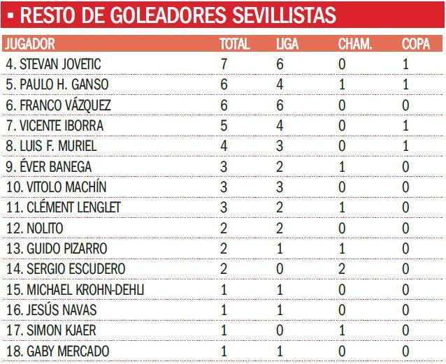 Al margen de los 20 tantos de Wissan Ben Yedder, los otros 63 se los han repartido entre 17 futbolistas diferentes, entre los que destacan los ocho del 'Tucu' Correa y otros tantos de Pablo Sarabia, el segundo y el tercer máximo goleador de los de Nervión en este 2017.