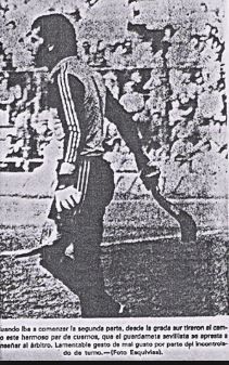 Los cuernos fueron lanzados desde Gol Sur durante el derbi del 20 de abril de 1980, en que el Real Betis ganó 4-0, con goles de Morán (dos), López y Biosca. De los supuestos disparos recibidos con escopeta de plomillos nunca se había comentado nada hasta el momento.