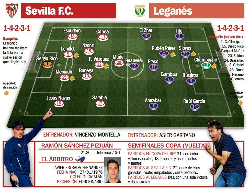 Un fallo del joven meta -con falta o no- dejó precisamente abierta la eliminatoria al provocar el 1-1 de la ida. Y a ese ajustado marcador se aferra el Leganés para tratar de dar la campanada, algo que Garitano buscará con la duda de Gabriel Pires, aunque recupera a Rubén Pérez con respecto a la ida. Un lobo con piel de cordero que ya se cargó a Villarreal y Real Madrid jugando la vuelta fuera, con victoria incluida en el Bernabéu, por lo que relajarse y confiarse no es una opción válida.