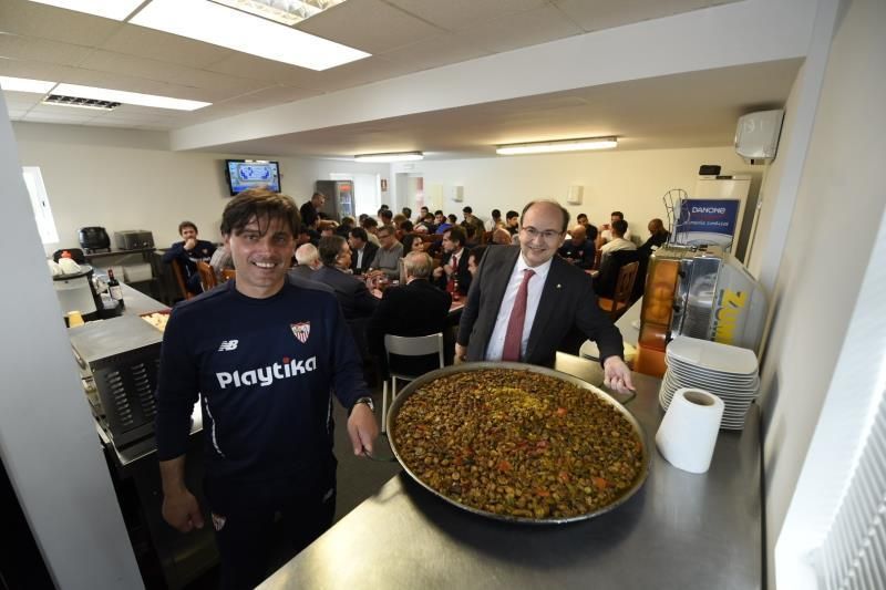 El almuerzo tuvo lugar en la ciudad deportiva sevillista tras el entrenamiento del primer equipo y transcurrió entre el buen ambiente y animadas conversaciones, como las que tuvieron el presidente del club, José Castro, y técnico de la plantilla, el italiano Vincenzo Montella.