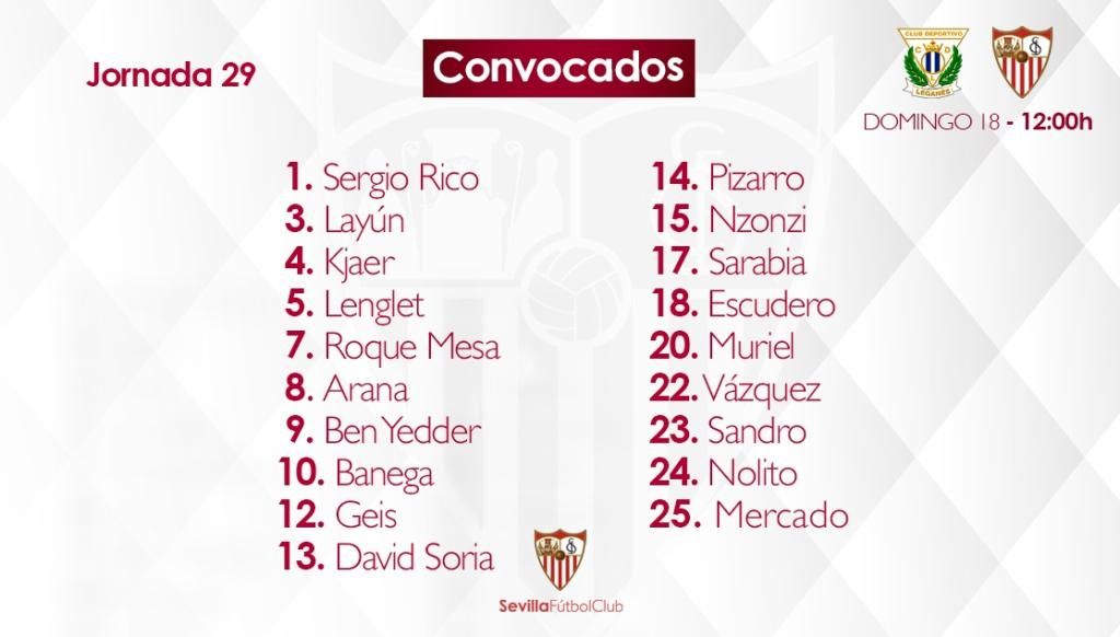 Con todo ello, la lista está conformada por: Sergio Rico, David Soria, Kjaer, Lenglet, Mercado, Layún, Arana, Roque Mesa, Banega, Nolito, Geis, Ben Yedder, Pizarro, Nzonzi, Franco Vázquez, Sarabia, Escudero, Sandro y Muriel.