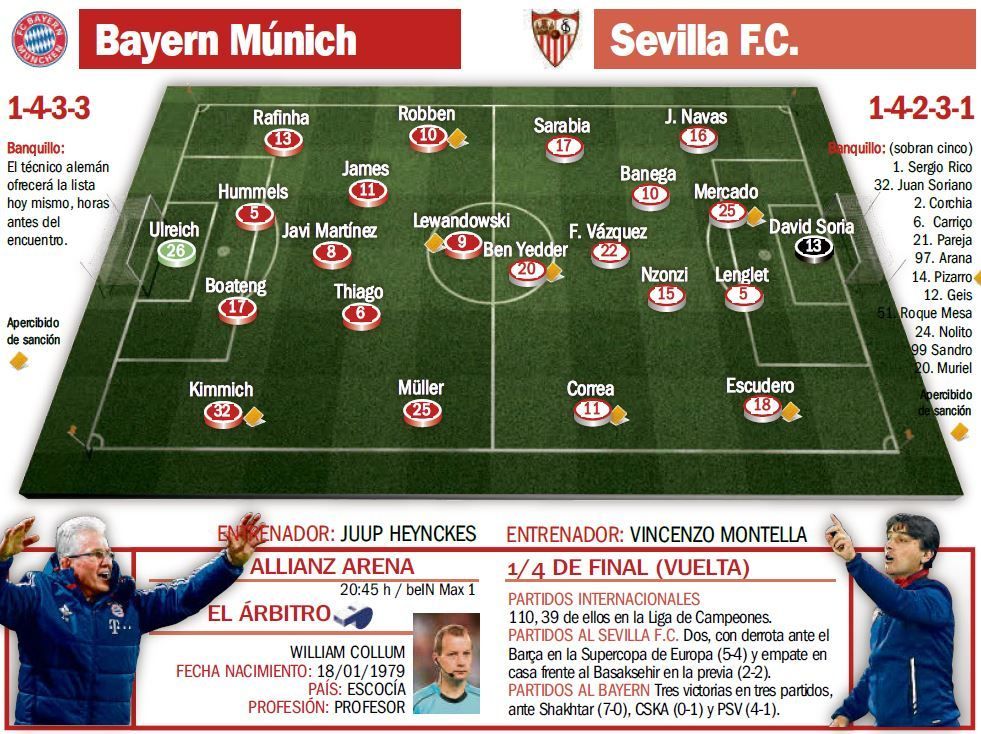 Con uno u otro, la clave está en encontrar ese acierto rematador que no llega, mal endémico que habrá que solucionar en verano, amén de cortar la sangría atrás, premisa básica ante un equipo con el potencial ofensivo de un Bayern que viene de proclamarse campeón de la Bundesliga y reservar hasta siete jugadores. No llegan a tiempo Alaba ni Vidal, apostando esta vez Heynckes por Robben, lo que sacará del once a Ribèry o Thiago. Nombres que asustan. Pero hay que luchar, creer, soñar... y no rendirse jamás ¿Y si el Sevilla hace una de las suyas?