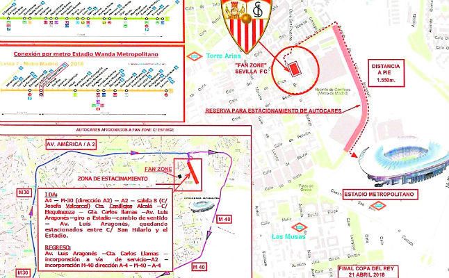 Los hinchas nervionenses podrán concentrarse en las cercanías del estadio en un recinto habilitado en la explanada terraria junto al Parque de Canillejas, a 1,5 kilómetros del escenario del partido, que habrá que recorrer a pie. La ‘fan zone’ se abrirá a las 12:00 y se cerrará a las 18:00 horas, pues desde las seis y media se abren las puertas para poder acceder al campo. Para llegar al lugar del ‘stage’, la Policía sugiere que todos los aficionados, a excepción de los que viajan en buses acreditados para estacionar junto a la misma, tomen también el subterráneo. Para el trayecto de ida al Wanda, se recomienda tomar la Línea 5, hasta la parada de Canillejas (Zona A del Metro de Madrid), que es la más cercana al Fondo Norte, donde estará ubicada la hinchada sevillista. Desde la parada de Canillejas al Metropolitano hay un trayecto a pie de 25 minutos. Para la vuelta, hay dos opciones: bien tomar la Línea 5 desde la parada de Metro de Canillejas, que cierra a las 01:30 horas, o bien tomar la Línea 7 desde la parada Metropolitano (Zona A del Metro de Madrid), ubicada en la parte Sur del estadio, con hora de cierre prevista a las 02:30 horas.