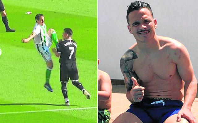 Sin embargo, el duelo cainita ha dejado un llamativo parte de guerra tras su disputa, incluso tatuado en el cuerpo de uno de los futbolistas. Es el caso de Roque Mesa, que ayer publicó una foto en su piscina en la que se puede apreciar con nitidez la marca de los tacos de la bota de Guardado en su hombro izquierdo. Y es que el mexicano se los clavó durante la primera parte en una acción en la que impactó con fuerza en el futbolista canario, quien no hizo ningún tipo de teatro y apenas si se quejó pese a la potencia y lo aparatoso del golpe. Cuando se dio cuenta de que había impactado contra un rival, Guardado encogió la pierna, lo que no evitó dejar una herida en el cuerpo del centrocampista nervionense. El colegiado castigó la entrada con tarjeta amarilla al azteca al considerar que no hubo voluntariedad.