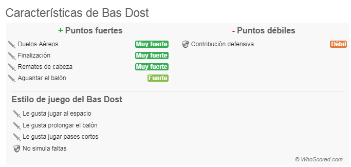 Gracias a Bas Dost, el 23% de los tantos del Sporting en la 17/18 ha llegado tras remates de cabeza. El ex del Wolfsburgo ha ganado una media de 4,8 duelos aéreos por partido, ya que supone, además, una excelente vía para que el equipo salga directo, merced a su capacidad para ganar balones, bajarlos y retenerlos, a la espera de la segunda línea.