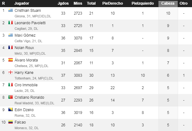 Es una cifra muy alta. De hecho, nadie de las cinco grandes ligas de Europa le supera en este registro, siendo, no casualmente, Cristhian Stuani (a quien tuvo Machín en el Girona) el segundo que más ha goleado con su testa (10).