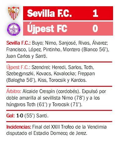 segunda mitad tras un medido pase de Francisco, siendo el capitán Curro Sanjosé el encargado de recoger el Catavino de Oro de manos de un jovencísimo Pedro Pacheco, alcalde de Jerez. Un 1-0 con tanto de Santi dio aquel torneo a los sevillistas en un igualado envite.