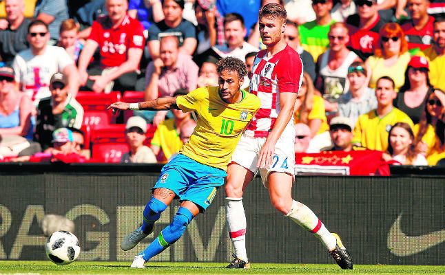 Caleta-Car, con el dorsal 24, forcejea con Neymar durante un amistoso previo al Mundial de Rusia.Á. Palomo / Ó. Murillo