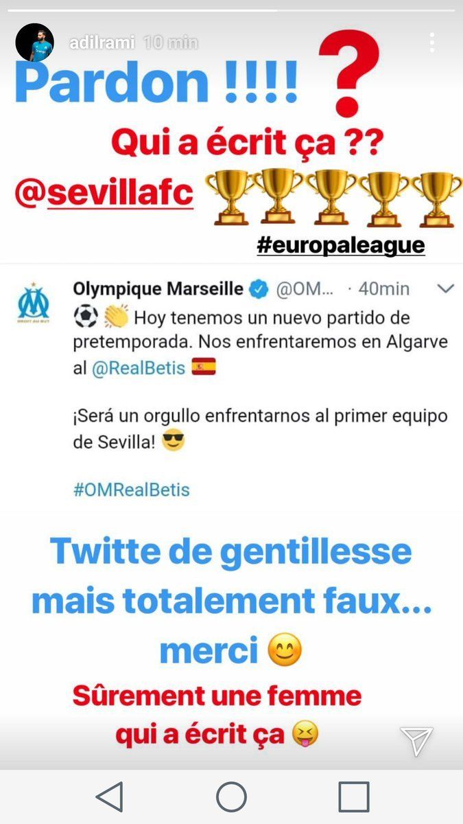 Si a comienzos de la tarde se dejaba notar entre la masa social de Twitter el comunicado realizado por la cuenta del Olympique de Marsella en el que afirmaban que 'se enfrentarían al mejor equipo de Sevilla', el exsevillista -y actual jugador del Marsella- Adil Rami ha intentado echar un cable a su exequipo, cometiendo un grave error.