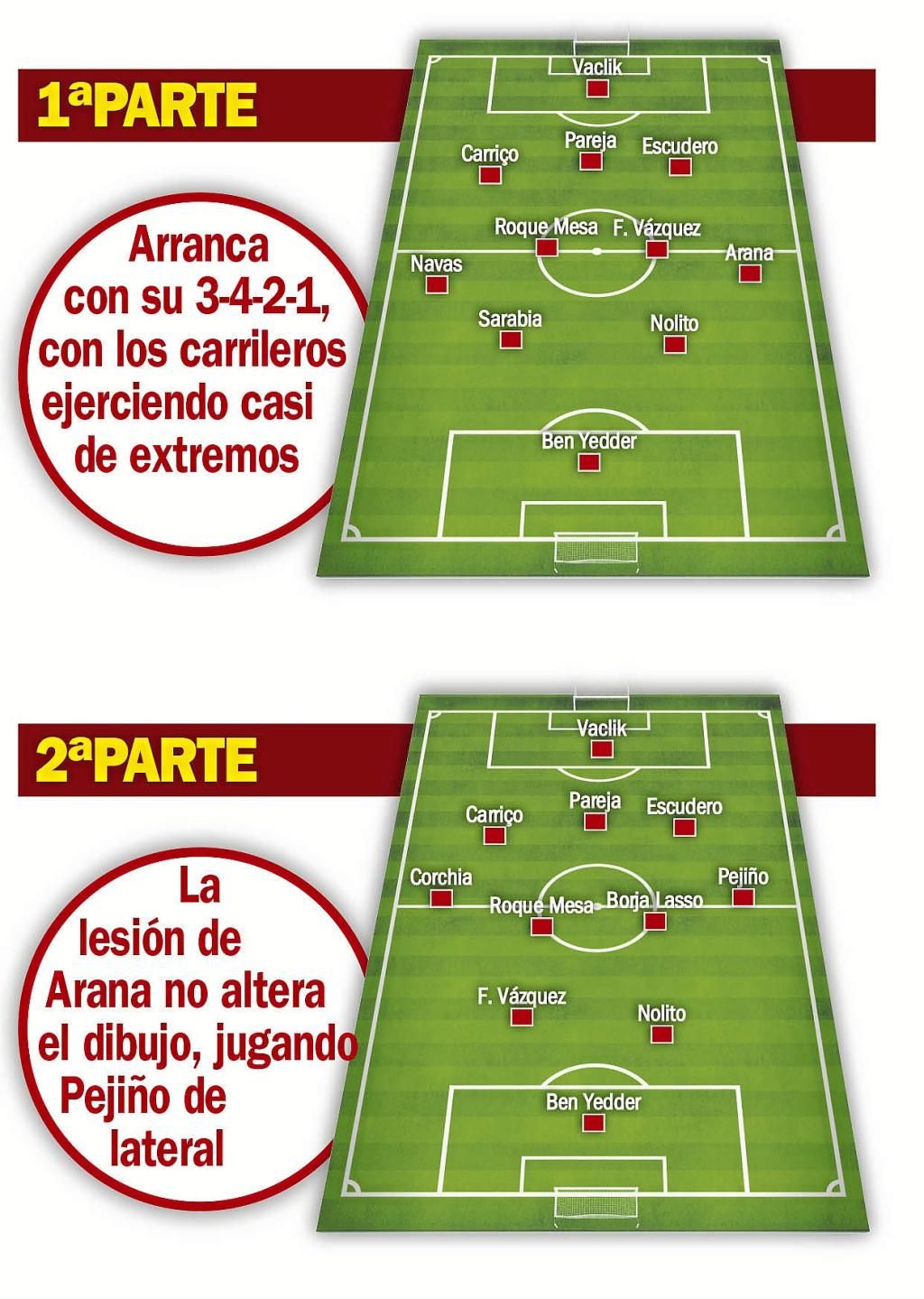Las probaturas apuntan a una dirección común, a una filosofía con capacidad para mimetizarse sin problemas a la ambición sevillista. Ayer se apreció con nitidez ante el Újpest. Con los carrileros como extremos aprovechando la autopista dejada por el movimiento hacia el centro de los mediapuntas ante un rival replegado y Jesús Navas como estilete. Y con dos de los centrales adelantados en su perfil para apoyar en la salida.