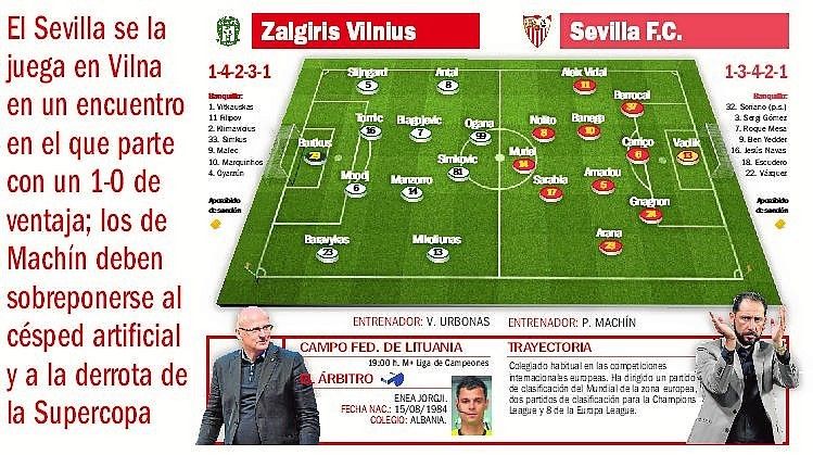 Por su parte, el Zalgiris Vilnius volverá a confiar en el once que sacó el 1-0 en el Ramón Sánchez-Pizjuán. Resultado que los lituanos consideraron un éxito al término del duelo.