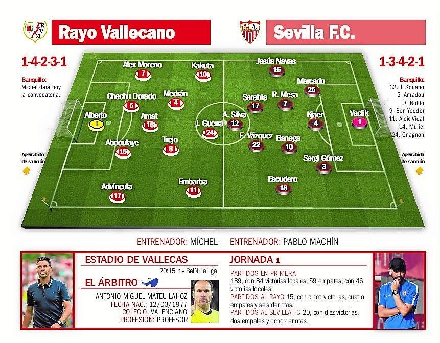 En el plano deportivo, Míchel cuenta con la baja por sanción del centrocampista Santi Comesaña. El once que presentará es una incógnita, habiendo guardado sus cartas a lo largo de la semana. Sí se espera, sin embargo, el debut de algunos refuerzos ilusionantes para la hinchada franjirroja, como es el caso del lateral derecho peruano Luis Advíncula o el extremo malagueño José Ángel Pozo, uno de los mejores jugadores de Segunda la pasada temporada en el Almería.