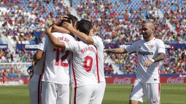 Era obligatorio para Machín encontrarle sitio a Ben Yedder y el soriano lo hizo variando su sistema de inicio por vez primera. Juntó al francés con André Silva en punta y por detrás dibujó un trivote sin ningún mediocentro defensivo, en el que Banega se incrustaba en el vértice inferior para quedar escoltado por Sarabia y el Mudo. Sobre el papel, jugones para tener la pelota. Aunque en la práctica, el centro del campo no existió y el balón fue muy pronto propiedad de un Levante que, pese al resultado, desarboló por completo a una pobre zaga sevillista durante la primera mitad.