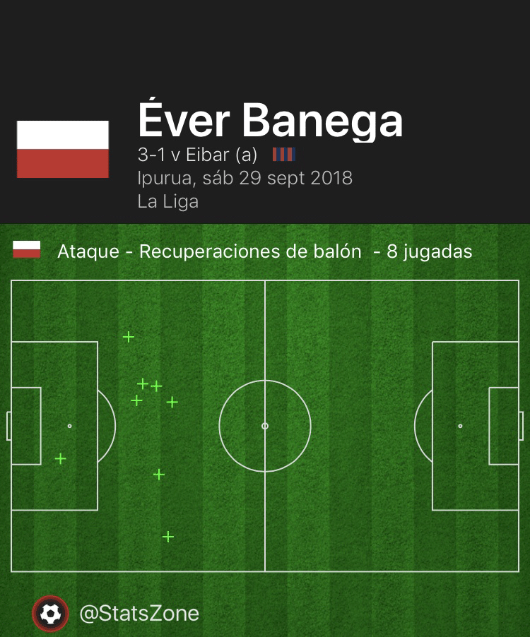 No en vano, en Eibar, como se aprecia en la imagen de sus robos (seis de los nueve fueron en la izquierda), estuvo siempre muy cerca de Arana, para que no le hicieran un dos contra uno, algo que resultó a la postre clave para que los centrales no tuviesen que acudir a ayudar al brasileño a la banda y, por tanto, pudiesen quedarse en superioridad dentro del área ante los dos delanteros del Eibar, que juega a entrar por fuera y rematar. Hasta 43 centros intentaron los locales, sin que Kike García ni Sergi Enrich los oliesen. Y la cuestión es que como mediocentro sigue aportando pausa, distribuyendo, regateando, provocando faltas y llegando.