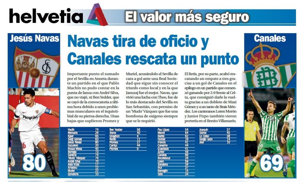 Unas bajas que suplieron Promes y Muriel, acusándolo el Sevilla de cara a gol ante una Real Sociedad que sigue sin conocer el triunfo como local y en la que Januzaj fue el mejor. Navas, que vivió una lucha con Theo, fue de lo más destacado del Sevilla en San Sebastián, con permiso de un 'Mudo' Vázquez que fue una bombona de oxígeno siempre que se le requirió.