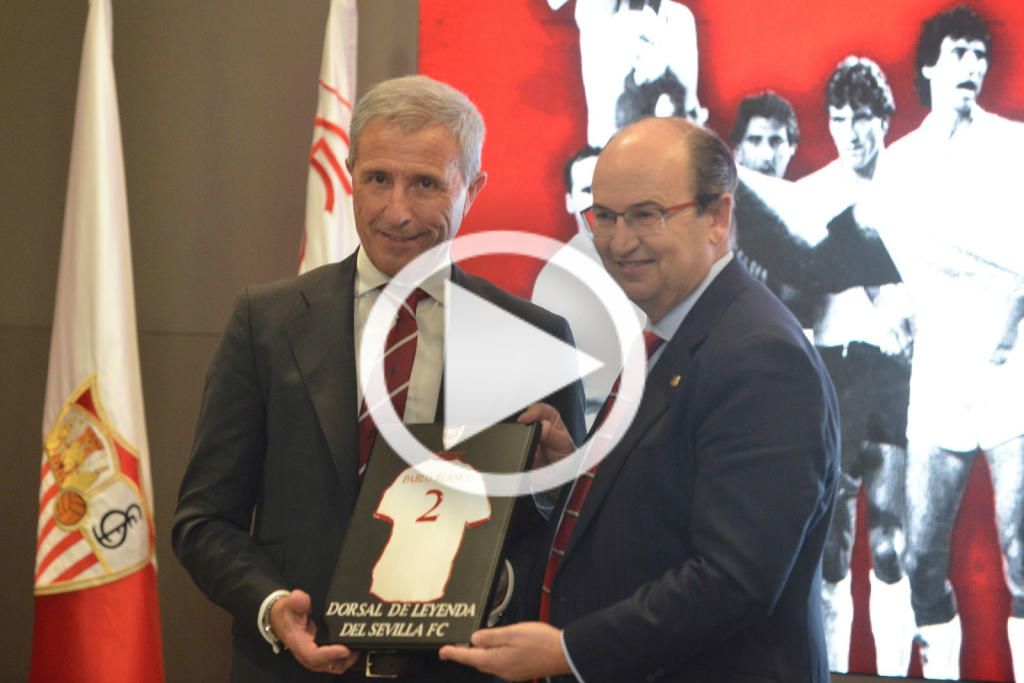 Especial ha sido para el director de cantera la presencia de Daniel Bertoni, que ha viajado a Sevilla desde Argentina. "He cruzado todo el Atlético para verte, pero te lo mereces. Estoy orgulloso de haber vivido momentos tan lindos y es verdad que no ganamos nada, pero el Sevilla ha hecho las cosas muy bien en todo este tiempo. Pablo vino una vez a Buenos Aires y decía que era linda, pero Sevilla es Sevilla. Él ama a esta ciudad y a este club. Pablo, verdaderamente me atendiste como si me conocieras de toda la vida y es verdad que no hablamos mucho, pero la amistad perdura para siempre. Al club le digo que siga dándole a las leyendas lo que merecen, y como dice Pablo, en Sevilla hay que morir", ha comentado el argentino. También el presidente José Castro ha glosado los méritos de Blanco para recibir del Dorsal de Leyenda. "Pablo Blanco es el perfecto anfitrión de grandes como Biri, Scotta, Bertoni, Pintinho, Juan Carlos Álvarez o Paco Buyo, el líder de un equipo que los sevillistas de mi generación recordamos con emoción. Todavía hoy muchos nos preguntamos como aquel equipazo, que varias veces estuvo a las puertas de una final de Copa, se quedó sin tocar plata. El fútbol es así. Pablo Blanco es también el marcador insaciable, el futbolista perfecto en los derbis, el hombre de club que jugaba allá donde hiciera falta€ Porque Pablo Blanco siempre ha estado para su club, tanto que incluso llegó a compaginar su faceta de jugador con la de secretario técnico. ¿Se puede entender la historia del Sevilla FC sin Pablo Blanco? Difícilmente, porque Pablo es nuestro escudo", ha señalado.