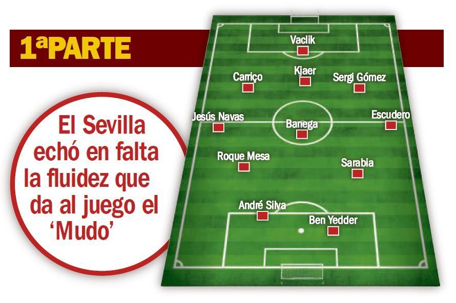 Este domingo, pese a la baja por sanción del 'Mudo', el de Gómara prefirió no adelantar a Éver Banega y dejarlo de '5', donde mejor está rindiendo, para situar a Roque Mesa en el lugar del 'Mudo'. Sin embargo, los primeros compases del partido fueron incómodos para los sevillistas.