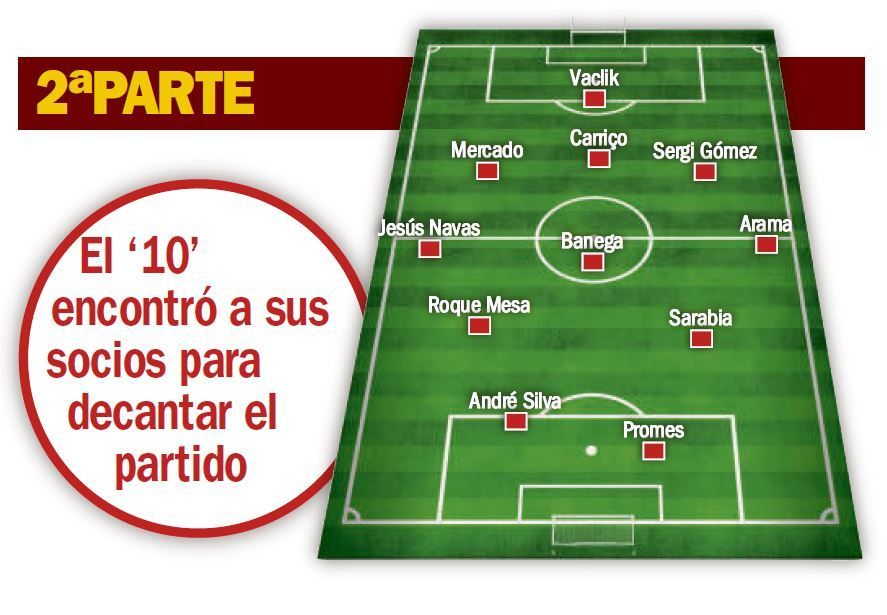 Era cuestión de tiempo que las ocasiones empezaran a llegar, que el fútbol de Machín fluyera. Navas, de regreso a la titularidad, fue de menos a más. Escudero se metía por dentro para las caídas al costado de André Silva, muy dinámico y peligroso entre los centrales gerundenses. Y es que el luso volvió a completar otro buen partido haciendo el trabajo sucio. No en vano, provocó el penalti con un buen quiebro a Juanpe que no tuvo más opción que derribarlo. No falló desde los once metros Banega en su cita con el gol.