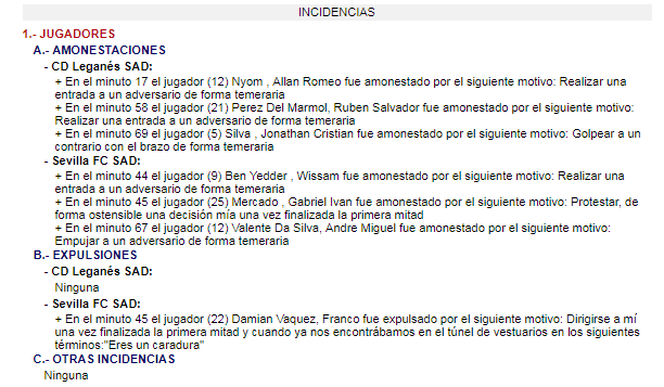 El italo-argentino se fue caliente tras señalar el árbitro el descanso, al entender que Hernández Hernández debió expulsar a Nyom. Sea como sea, el motivo de la roja directa se ha conocido tras redactar éste el acta y no parece que al mediapunta vayan a caer más de dos partidos, pues vio la roja tras decir: "Eres un caradura". Es decir, parece que se trata de una "desconsideración" o "menosprecio".