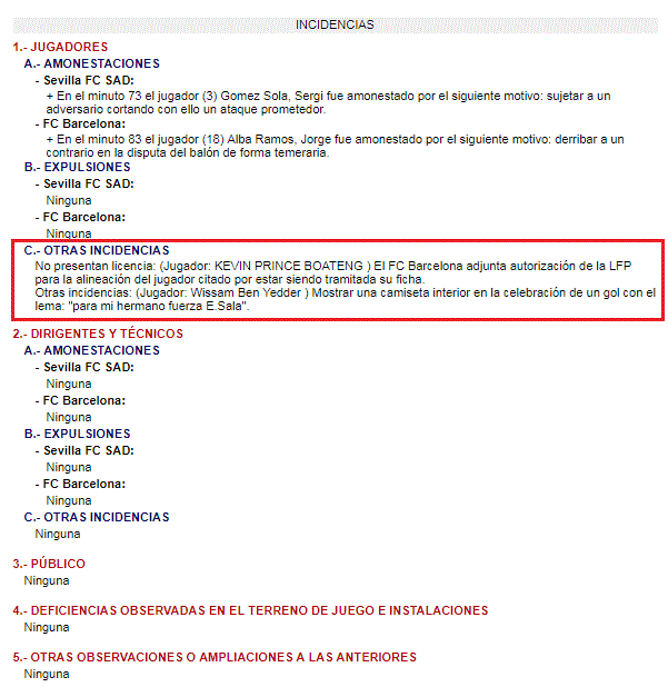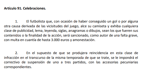 El trencilla madrileño reflejó en el acta, igualmenete, las palabras de recuerdo de Ben Yedder al desaparecido Emiliano Sala, con quien comparte agente. Y en este aspecto la normativa española es muy dura y contundente. No en vano, el artículo 91 del Código Disciplinario de la RFEF refleja los siguiente: "El futbolista que, con ocasión de haber conseguido un gol o por alguna otra causa derivada de las vicisitudes del juego, alce su camiseta y exhiba cualquiera clase de publicidad, lema, leyenda, siglas, anagramas o dibujos, sean los que fueren sus contenidos o la finalidad de la acción, será sancionado, como autor de una falta grave, con multa en cuantía de hasta 3.000 euros y amonestación".