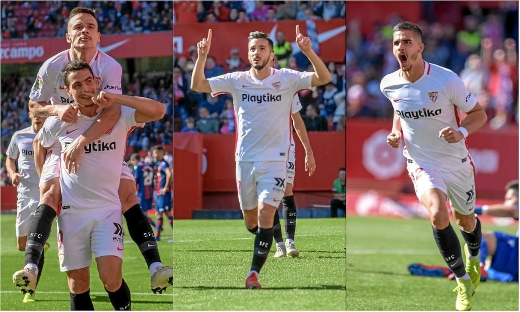 Ben Yedder, Sarabia y André Silva celebran sus goles ante el Levante.F. M.