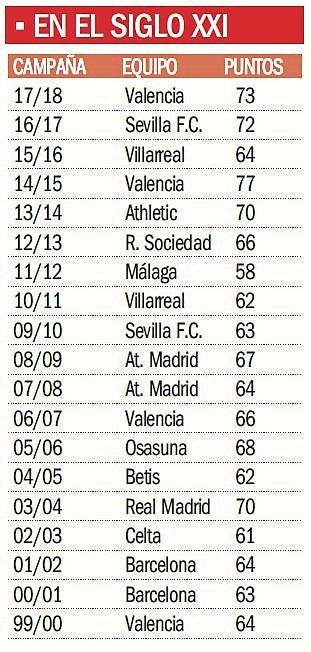 De las 19 Ligas disputadas en el siglo XXI, desde la 99/00, en diez ocasiones el cuarto clasificado acabó con 65 puntos o menos, lo que supone un 52,6%, mientras que en las nueve restantes hizo falta una mayor puntuación para conseguir el pasaporte a la máxima competición continental (47,3%).