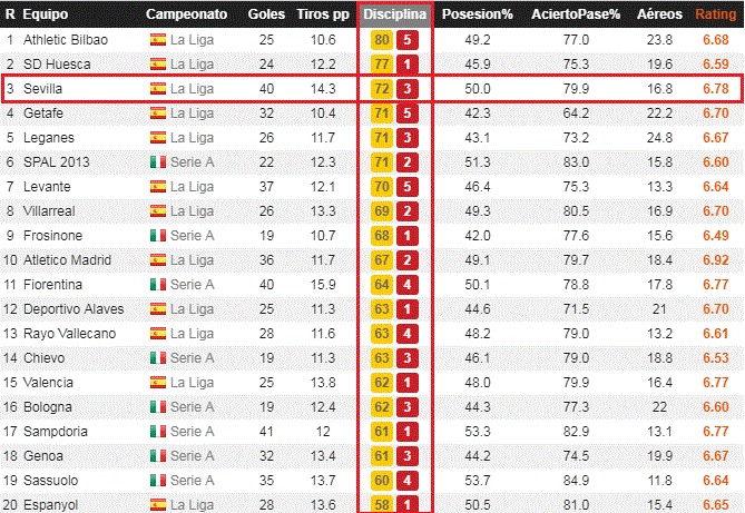 Porque las amonestaciones se suelen recibir por realizar una entrada dura, pero también por no saber defender correctamente. No se puede decir, de hecho, que el Sevilla sea un equipo que se emplee con dureza o bordeando el reglamento, como sí lo era, por ejemplo, el que adiestraba Joaquín Caparrós en su primera etapa en el banquillo nervionense. Y, sin embargo, sólo hay dos conjuntos en las cinco grandes ligas de Europa que hayan visto más cartulinas que el Sevilla en el campeonato doméstico (72 amarillas y tres rojas): Athletic (80 y 5) y Huesca, curiosamente, el próximo rival de los hispalenses.