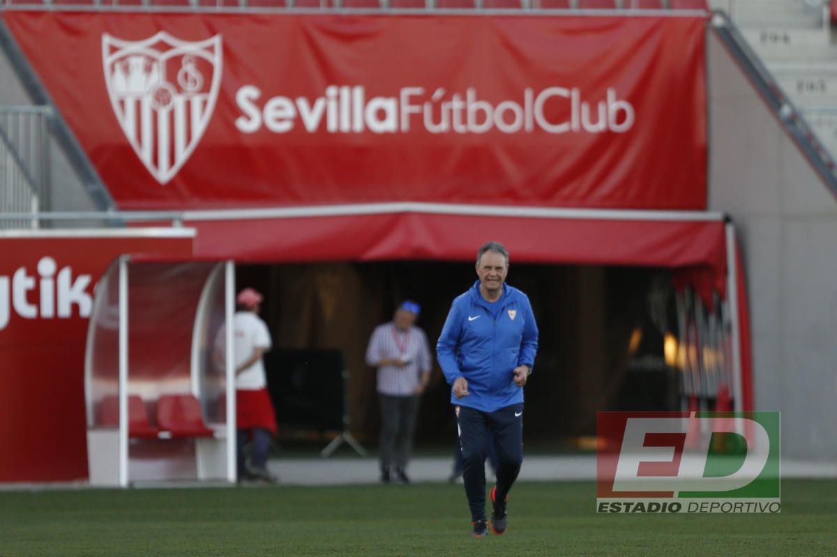 Después de que el equipo partiera de madruga desde Praga, donde el jueves quedó eliminado por el Slavia en los octavos de final de la Liga Europa, lo que desencadenó la destitución de Machín, el preparador utrerano dirigió una sesión acompañado por sus tres asistentes, los exjugadores sevillistas Carlos Marchena, Paco Gallardo y Antonio Álvarez.