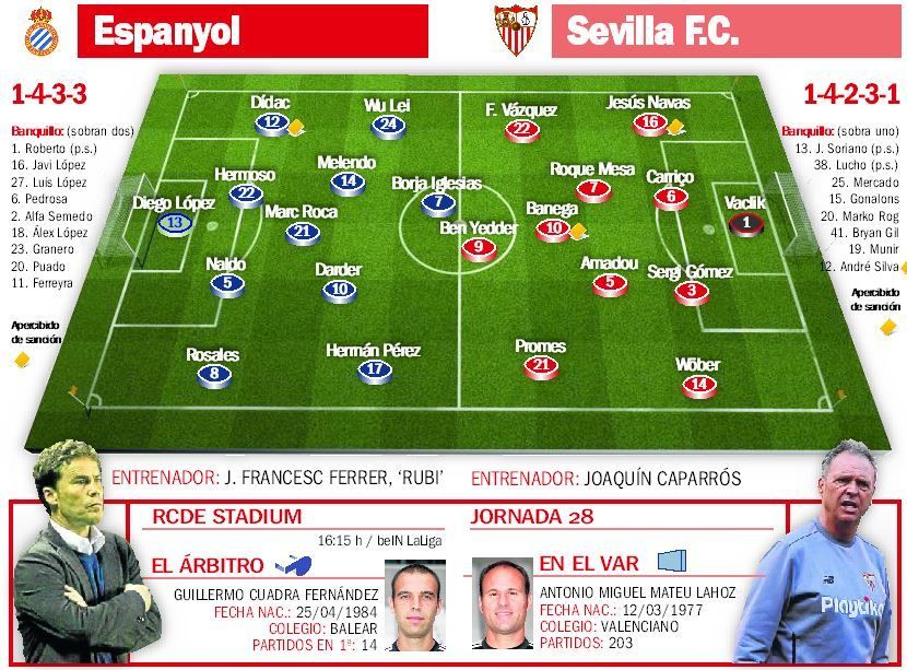 Por delante, el doble pivote se antoja innegociable, con Roque Mesa junto a Gonalons o Amadou si opta por un 4-2-3-1, o Banega junto al canario si se decanta por el 4-4-2. Eso determinará el resto de un ataque donde no estará Sarabia por lesión y en el que Promes parece fijo, pudiendo caer el Mudo al costado diestro como falso interior para dejar todo el carril a Navas. Y todo ello, ante un Espanyol que recupera a Darder, Dídac y Borja Iglesias y ha retomado las buenas sensaciones para sumar seis partidos sin perder.