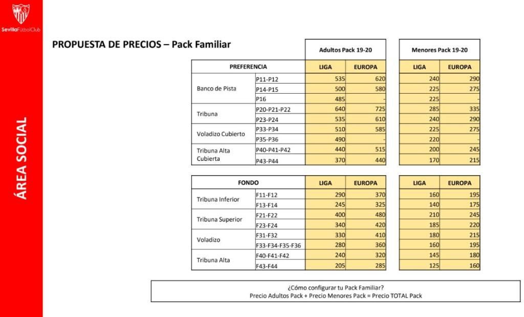 El club nervionense sigue apostando por el Pack Familiar (al que esta esta temporada suman la figura del abuelo) en las gradas de Preferencia y Fondo, cuyos precios son los siguientes: