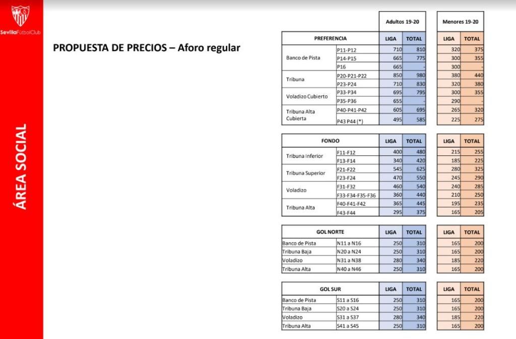 Los precios de estos abonos en las gradas de gol oscilarán entre los 250 euros (Abono Sólo Liga en Banco de Pista y Tribunas) a 340 euros (Abono Total Voladizo). En la grada de Fondo el Abono Sólo Liga se podrá obtener desde 295 euros mientras que el Total, mínimo, desde 375. En cuanto a la grada de Preferencia la opción Sólo Liga estará desde 495 euros y el Total desde 585 euros.