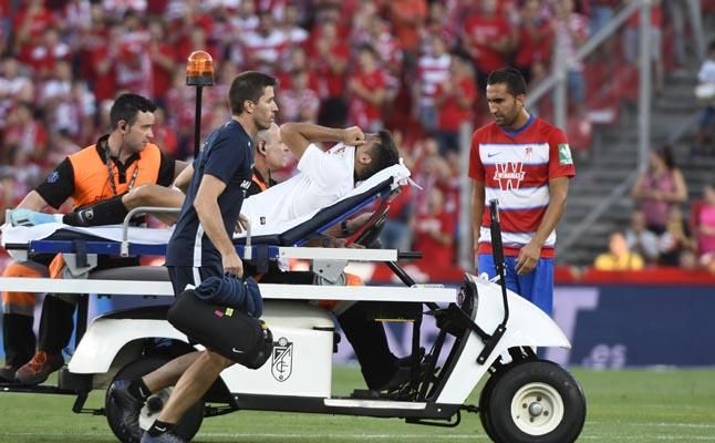 El lateral zurdo chocó con Víctor Díaz en el minuto 13 y ambos jugadores tuvieron que ser atendidos. El sevillista trató después de seguir jugando, pero tuvo que dejar el encuentro, aturdido.