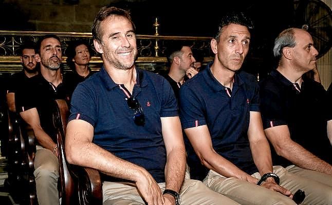 Lopetegui, en la entrega floral a la Virgen de los Reyes.F.R.