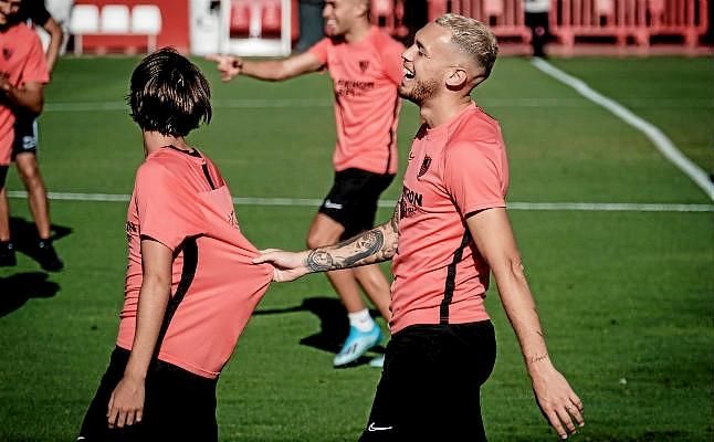 Lucas Ocampos bromea con Bryan Gil en un entrenamiento.F. M.