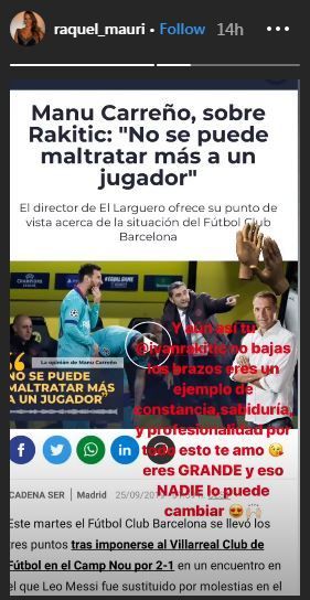 La mujer de Iván Rakitic, Raquel Mauri, ha salido en la noche de ayer en defensa de su esposo en Instagram, después de que el exjugador del Sevilla estuviera de nuevo en el banquillo y no tuviera ni un solo minuto de juego en el Barça-Inter disputado en el Nou Camp, en el que el Barelona fue capaz de remontar un 0-1 en contra.