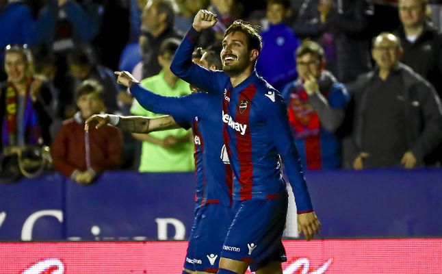 Campaña, celebrando un gol con el Levante.A. Sáez