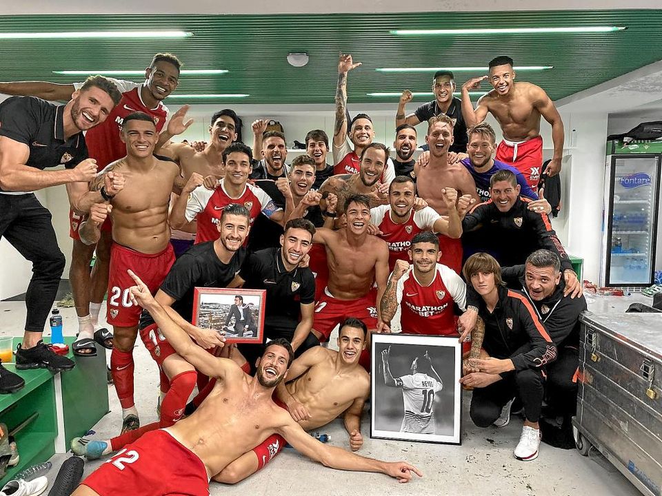 Las imágenes de Puerta y Reyes, junto con la plantilla del Sevilla en el vestuario del Villamarín.F. Ruiz
