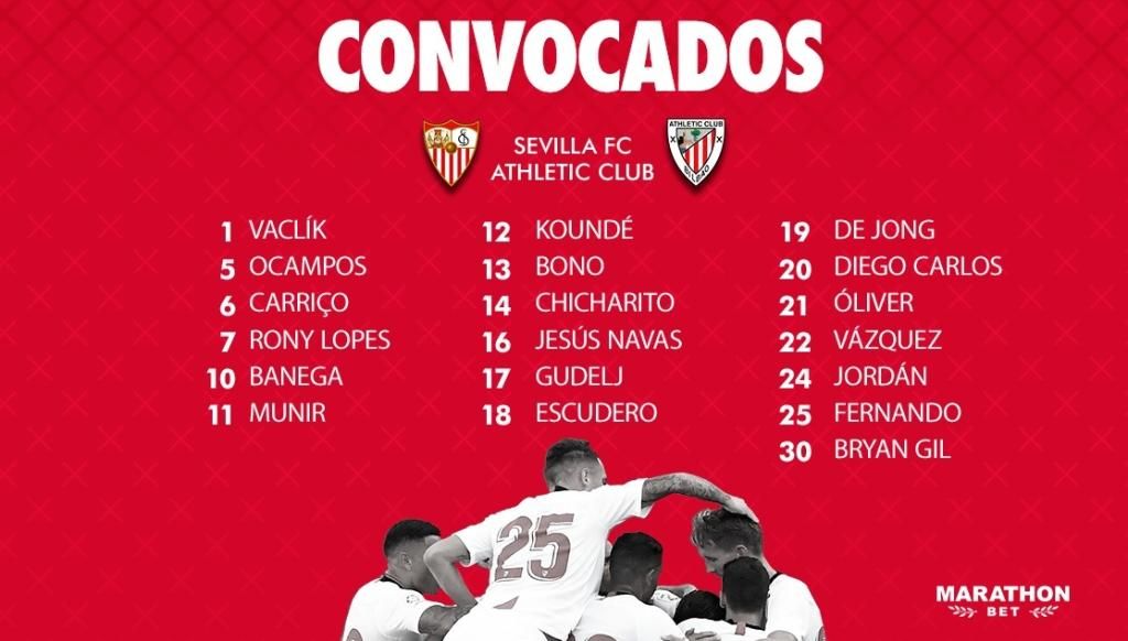 Así pues, estos son los 19 convocados, por lo que antes del encuentro Lopetegui deberá dejar a un jugadores en la grada. La lista completa es la siguiente: Vaclík, Bono, Carriço, Diego Carlos, Koundé, Jesús Navas, Escudero, Fernando, Gudelj, Jordán, Banega, Franco Vázquez, Óliver Torres, Ocampos, Rony Lopes, Bryan, Munir, Chicharito y De Jong.