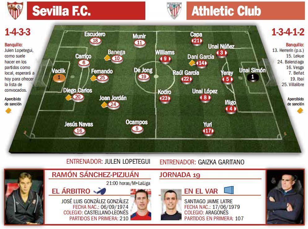 No en vano, enfrente estará un Athletic que clausuró su 2019 secando la pólvora de todo un Real Madrid en el mismísimo Santiago Bernabéu (próximo destino del Sevilla) con un gran trabajo defensivo y un cambio de dibujo que todo apunta a que mantendrá hoy. Garitano, que llega sin varios jugadores importantes, dio a entender que mantendrá la línea de tres centrales para romper una racha de cinco años sin marcar ni puntuar en el Sánchez-Pizjuán.