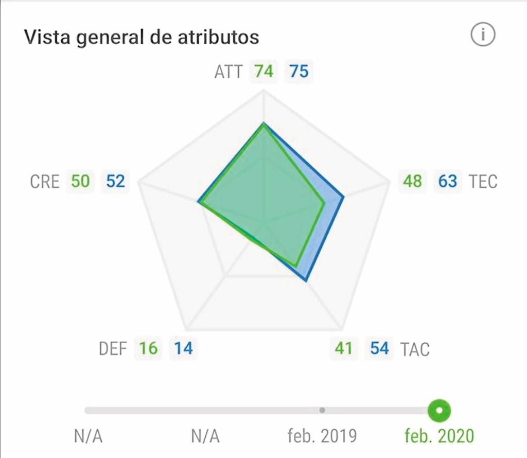 En lo que a atributos generales de uno y otro futbolista se refiere, el 'Data' pone de manifiesto que tanto En-Nesyri como De Tomás muestran una puntuación muy similar en ataque y en creatividad (74 y 50, ante 75 y 52), aunque un 'RDT' algo más curtido lo aventaja ligeramente. Su diferencia de edad también ayuda a ello.