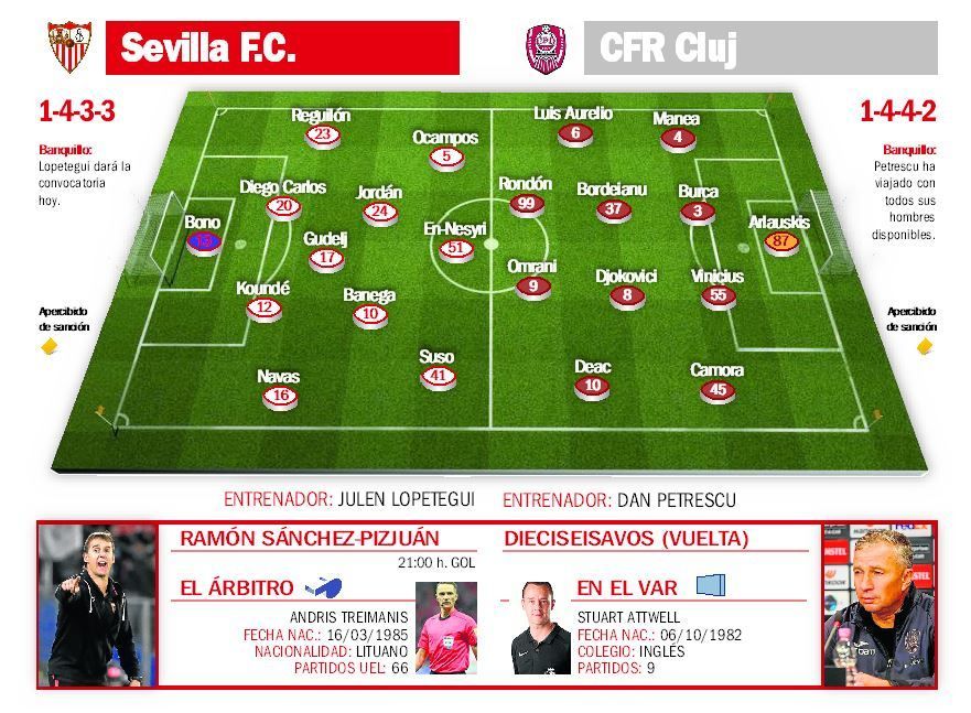 Menos dudas, a priori, presenta el ataque sevillista, teniendo Ocampos reservada la izquierda y Suso, la derecha. Tras el buen partido de De Jong ante el Getafe, todo apunta a que hoy cederá su sitio a En-Nesyri arriba, al ser el Cluj, quizá, un rival que le venga mejor al marroquí, a la hora de buscar los espacios a la espalda, como ya demostró en la ida. Pese a ello, tampoco sería descartable que el holandés repitiera de inicio.