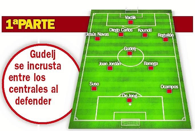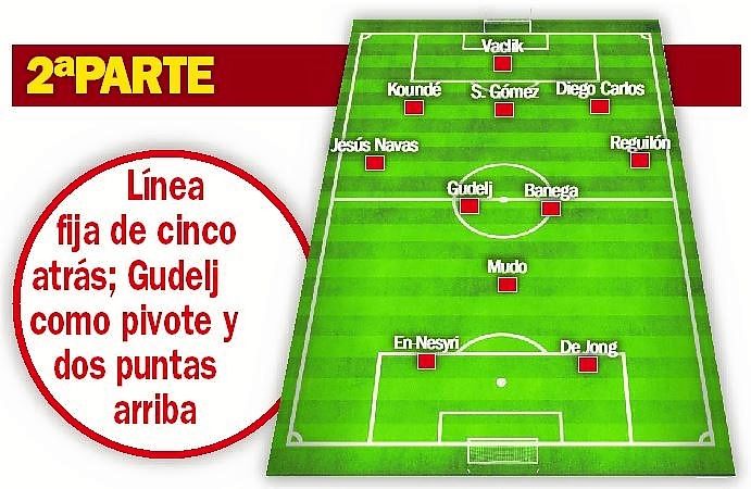 Sin Óliver, sancionado, Banega volvió a la sala de máquinas, pero demostró estar con la mente en otro sitio. Con el 2-2, Lopetegui metió a En-Nesyri por Suso y a Sergi Gómez por Jordán, jugando con una línea de cinco atrás fija y tres hombres de ataque arriba, mientras que Gudelj ya sólo era pivote. Para contrarrestar los arreones finales del Atlético, el vasco dio entrada al Mudo por un Ocampos más vertical, acabando con un 5-3-2 sobre el campo.